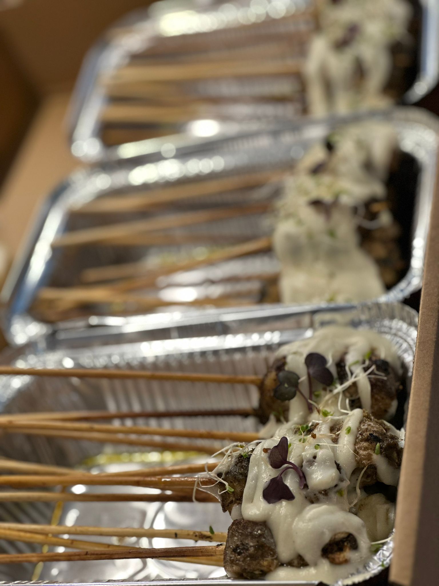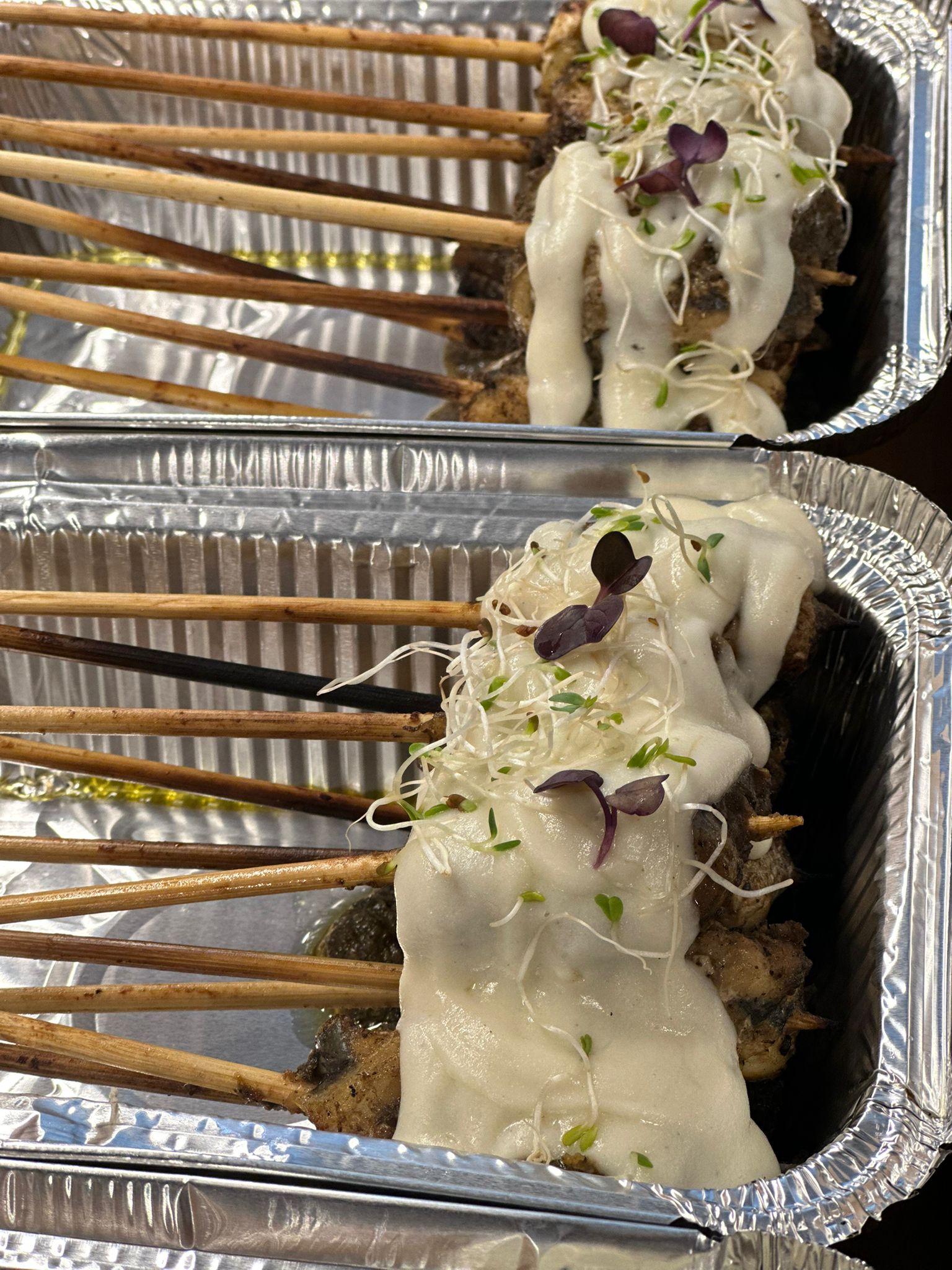 Die Fischspiese Box bietet Ihnen zarte, frisch gegrillte Doradenspieße, die auf den Punkt gegart und mit einer cremigen Yam-Mousse sowie liebevoller Dekoration serviert werden. Jede Box enthält ca. 18 Spieße plus eine aromatische hausgemachte Sauce, perfekt portioniert für kleine und große Runden.