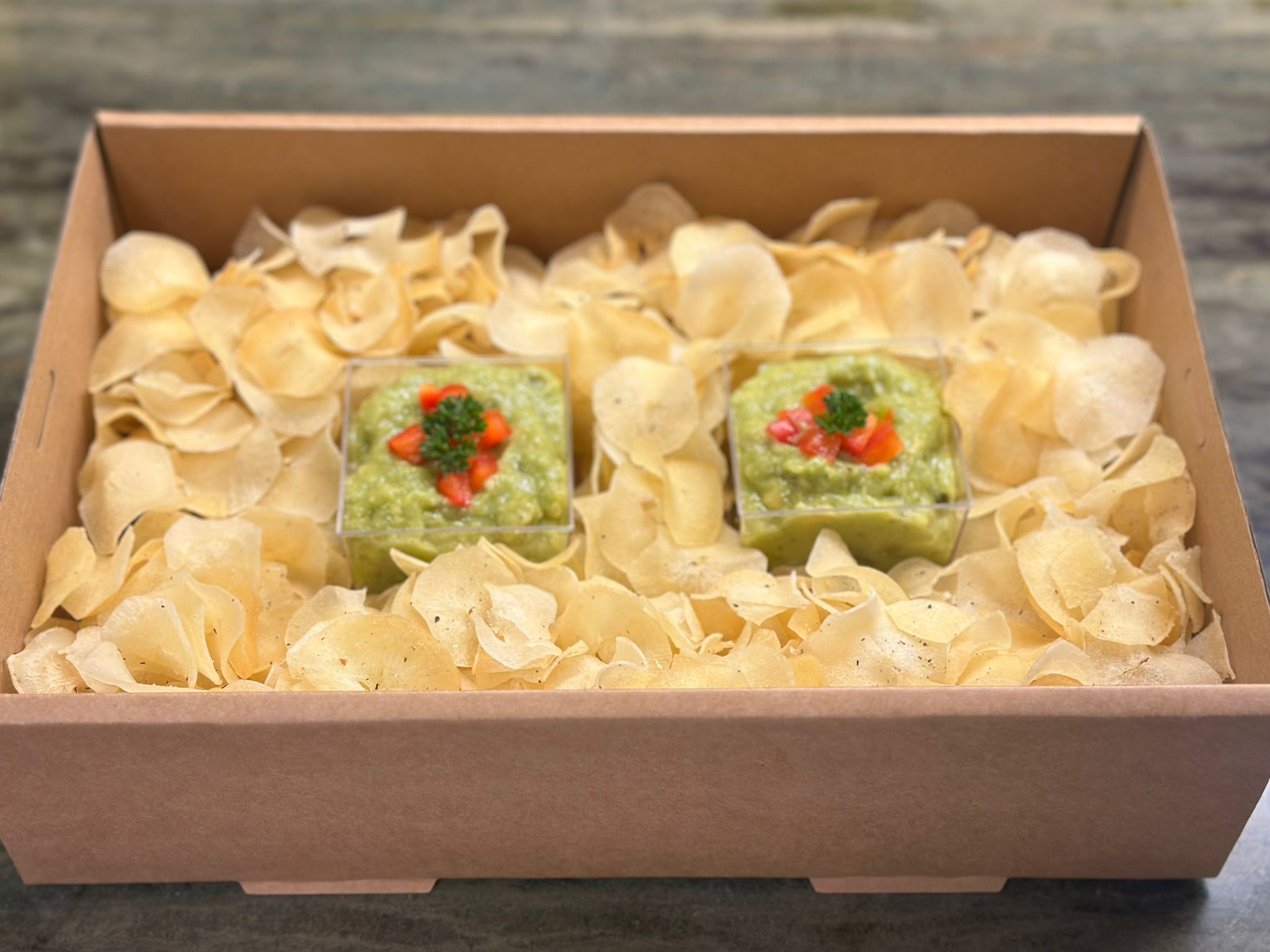 Maniok-Chips mit Avocado-Dip Box Hausgemachte Maniok-Chips mit cremigem Avocado-Dip. CHF 85.– pro Box (2 Dips, ca. 20 Portionen)