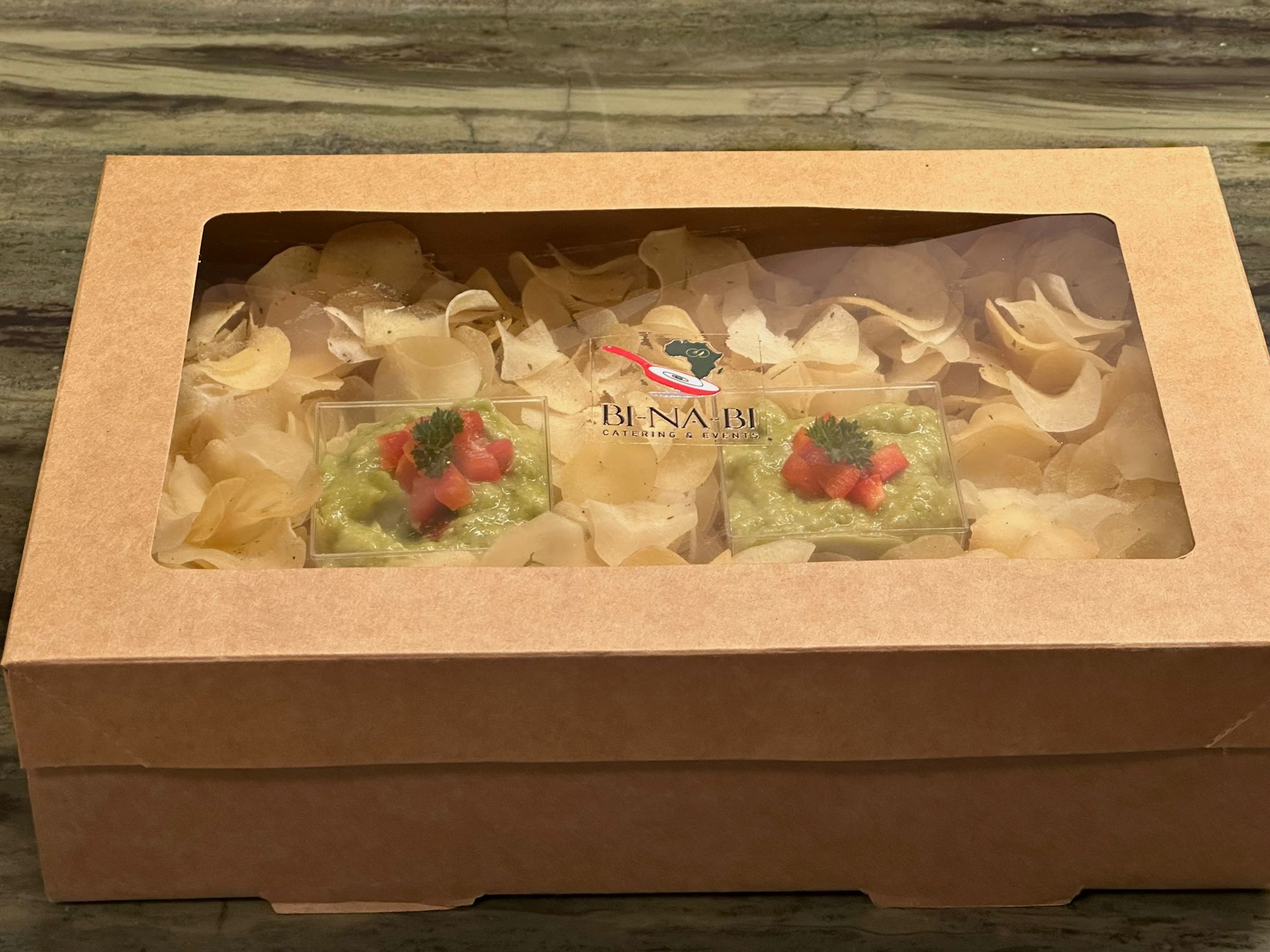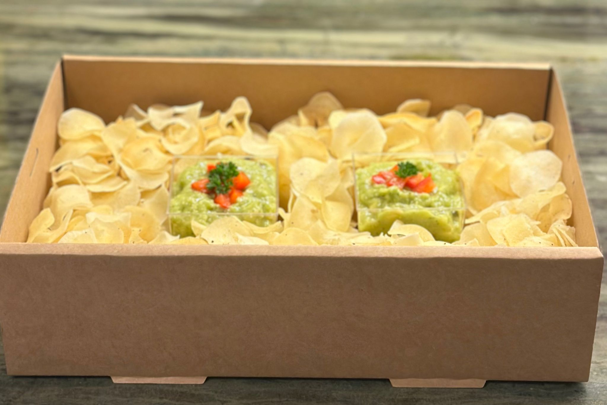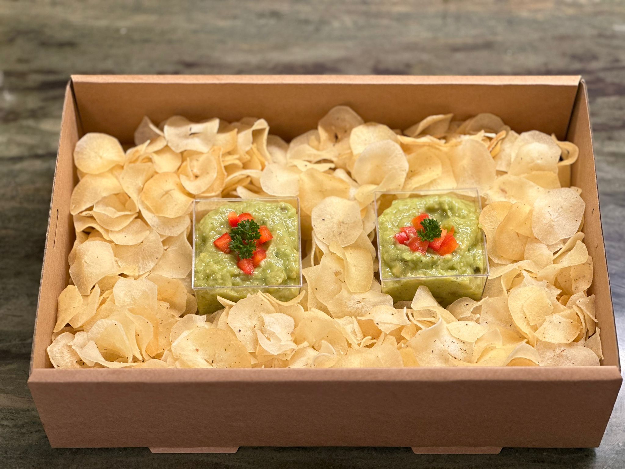 Maniok Chips Box mit Avocado-Dip Box