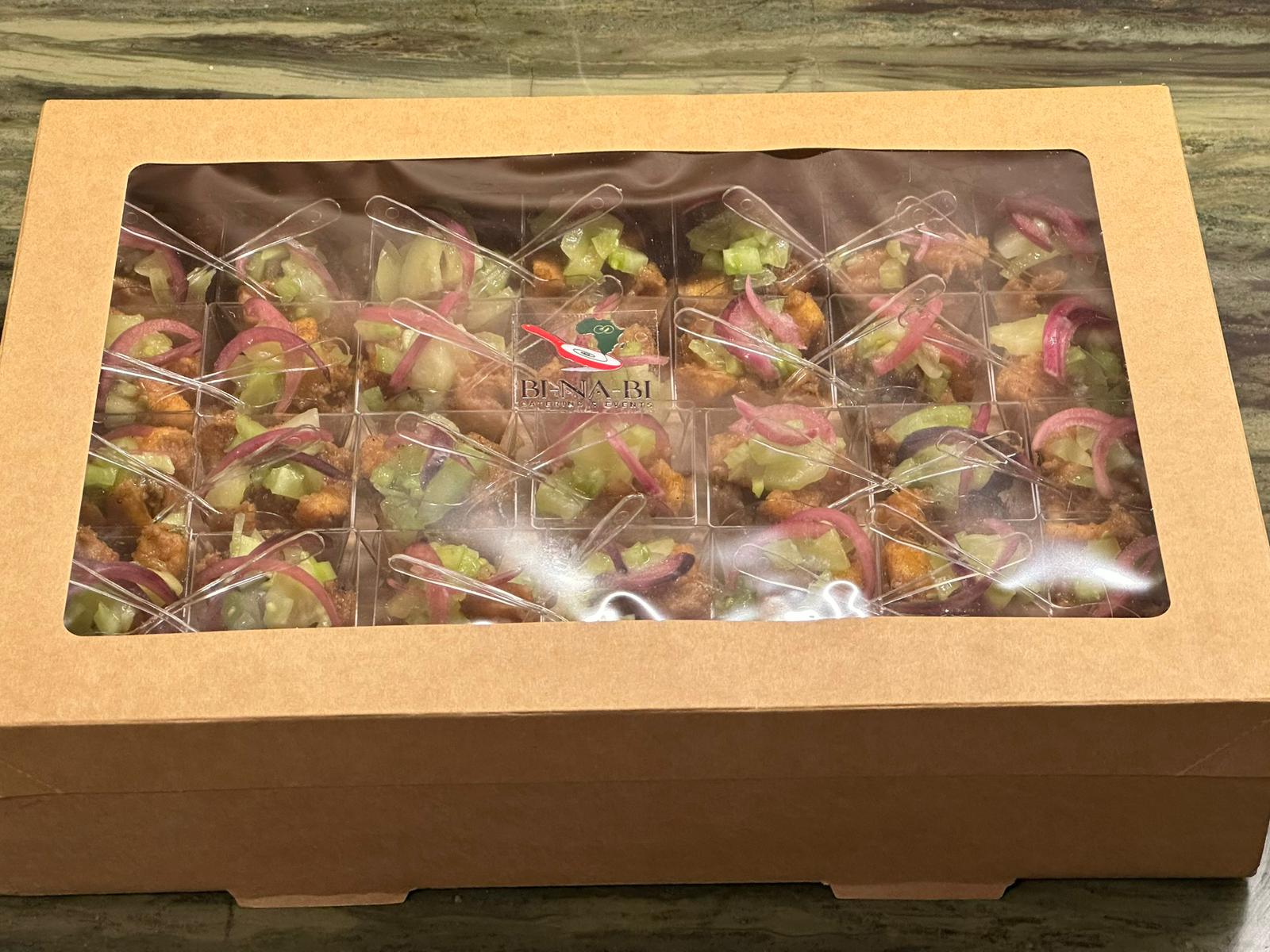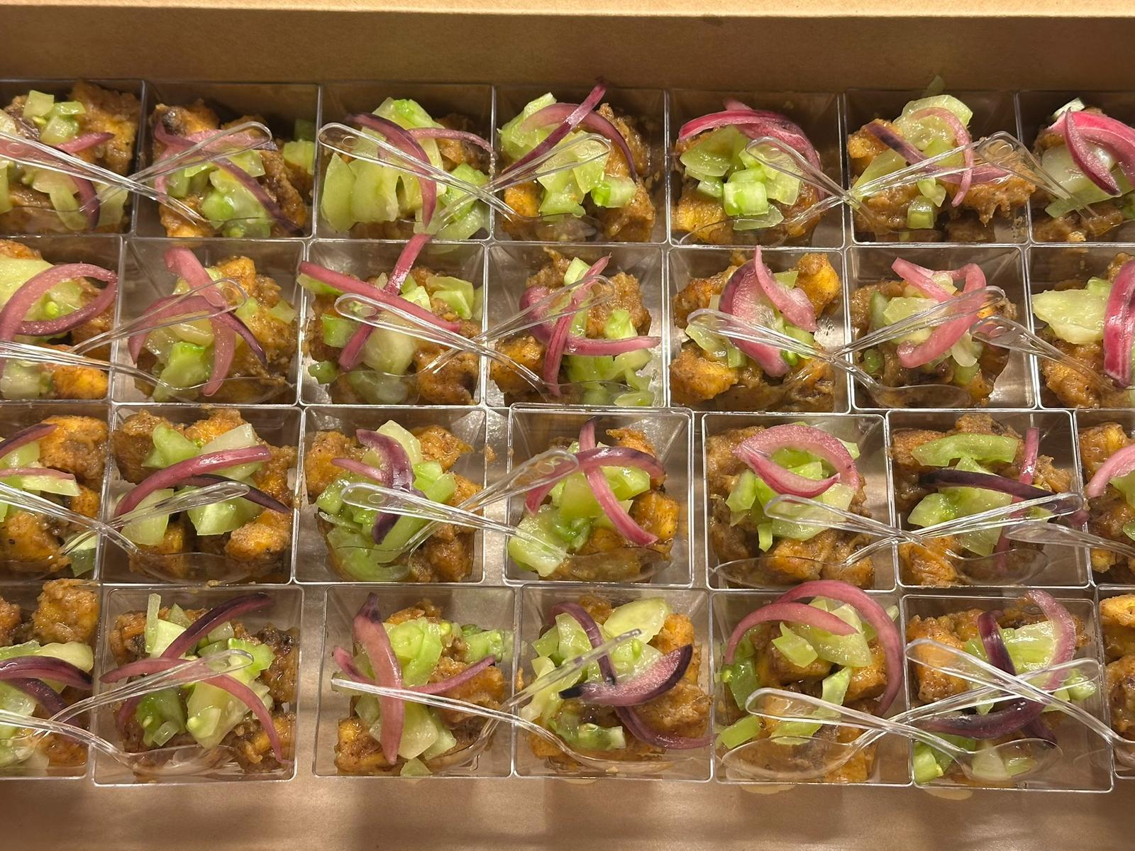 Veganer Afro-Fusion Genuss: knusprig frittierte Kochbananen mit saisonalem Gemüse, eingelegten roten Zwiebeln und aromatischer Kochbananen-Sauce.